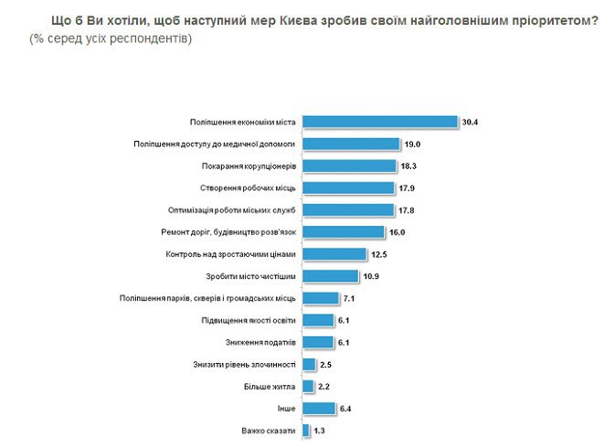 Основные пункты программ кандидатов во многом схожи: борьба с коррупцией, децентрализация власти, сохранение исторической части Киева, решение транспортных проблем, озеленение города. Если же обратиться к последнему соцопросу КМИС и посмотреть, какие приоритеты выставили сами киевляне, то видно, что приоритеты кандидатов в мэры города и горожан в некоторых вопросах существенно различаются.