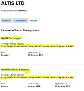 Согласно данным Британского реестра компаний, Екатерина – единоличная владелица британской фирмы Altis ltd, а что примечательно, секретарем фирмы записан Евгений Насиров, брат ее мужа.