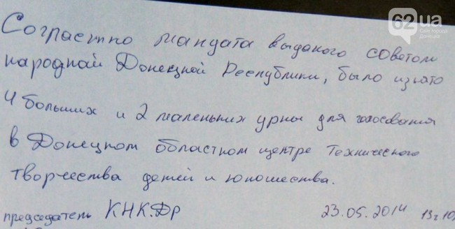 Основанием для изъятия урн сепаратисты назвали некий "мандат ДНР", на основании которого сотрудники центра составили расписку.