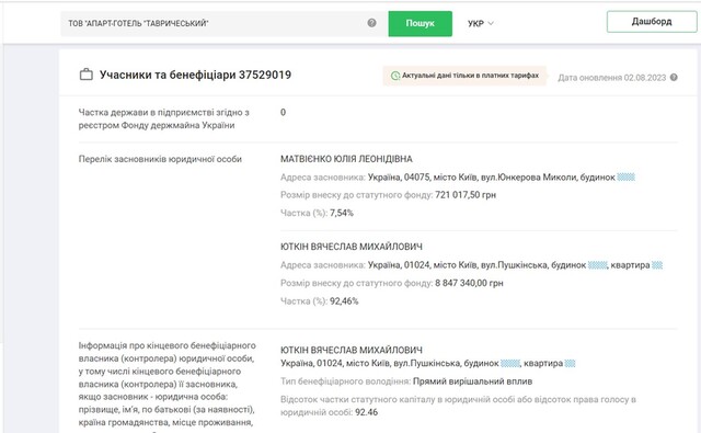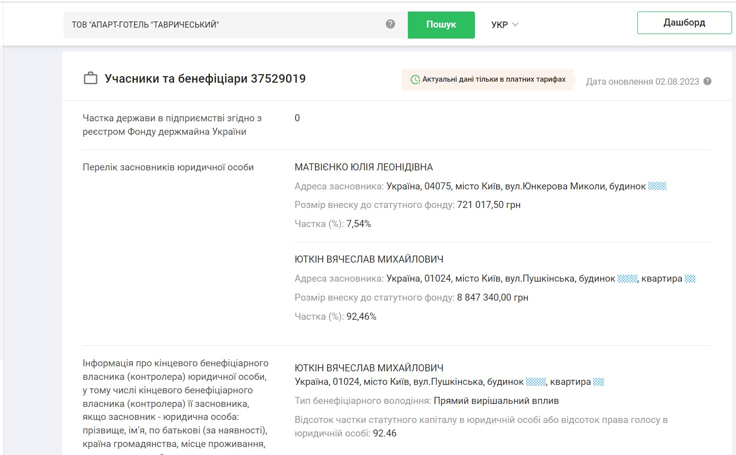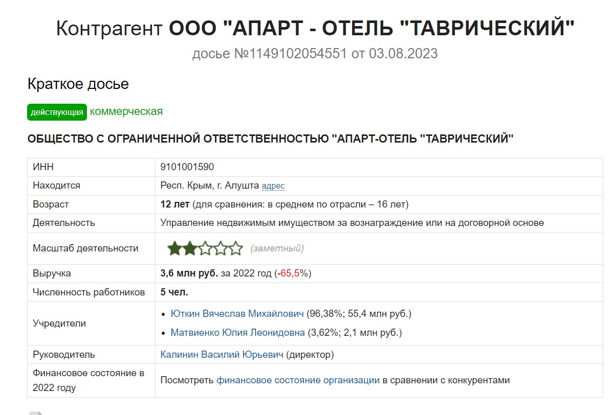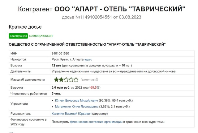 Але повернемося до російських реєстрів. Вони нам кажуть, що В’ячеслав Юткін, крім ТОВ «Морський», є засновником у ТОВ «Апарт-готель Таврійський», також зареєстрованому в «республіці Крим»: