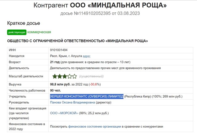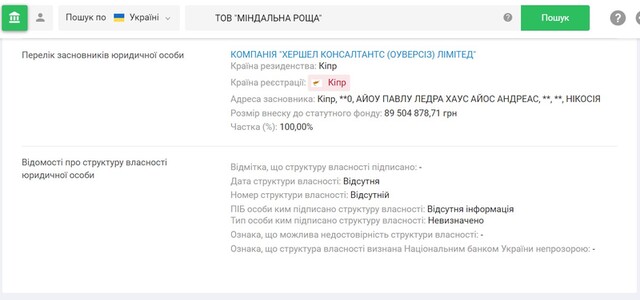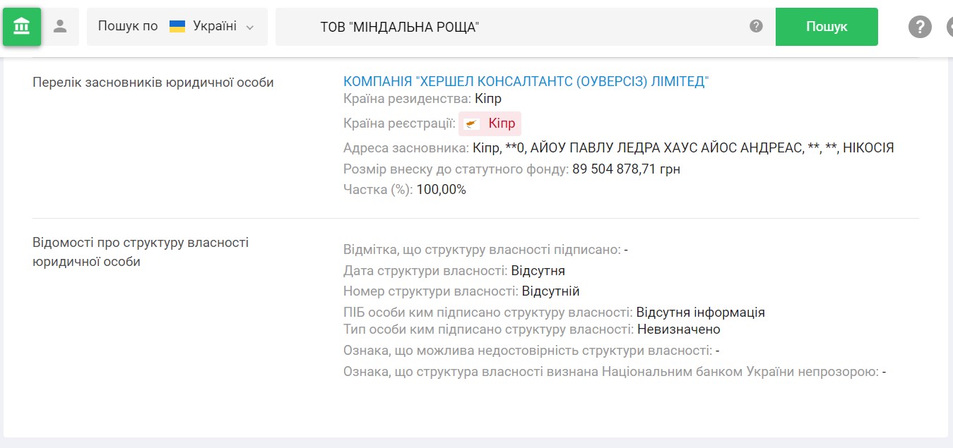 У ТОВ «Міндальний гай» власником значиться кіпрський офшор ХЕРШЕЛ КОНСАЛТАНТС (ОУВЕРСИЗ) ЛІМІТЕД: