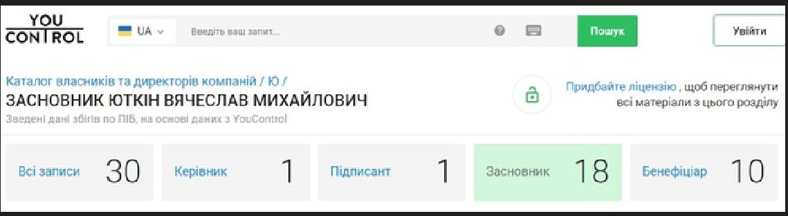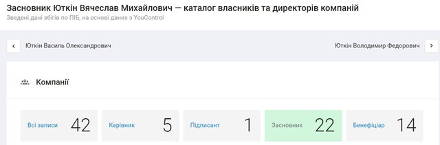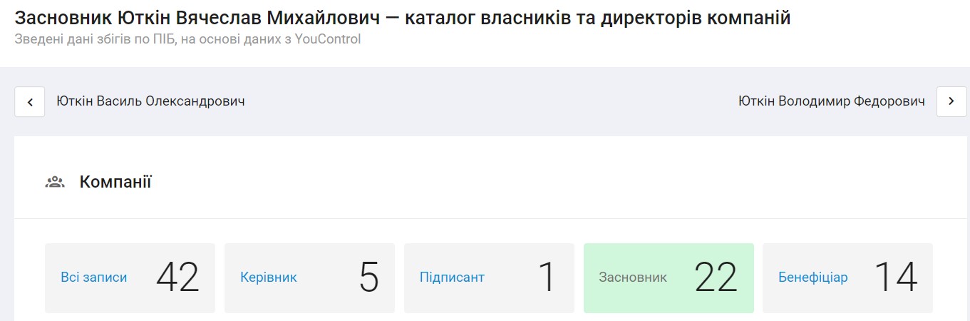 Так, згідно з даними сервісу «Юконтрол», станом на 1 серпня 2023 року Юткін вважається бенефіціаром у 22 фірмах та засновником у 14, не кажучи вже про п’ять організацій, в яких він є керівником, однієї, де має право підпису.