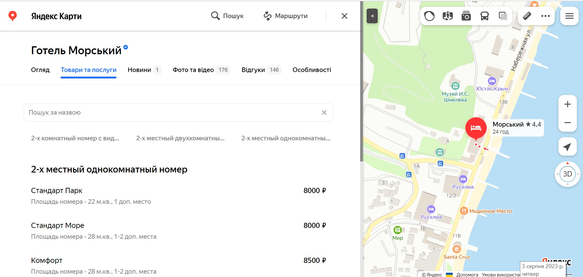 ТОВ «Морський» надає послуги у готельній сфері, про що свідчить пошук у російському «Яндексі»:
