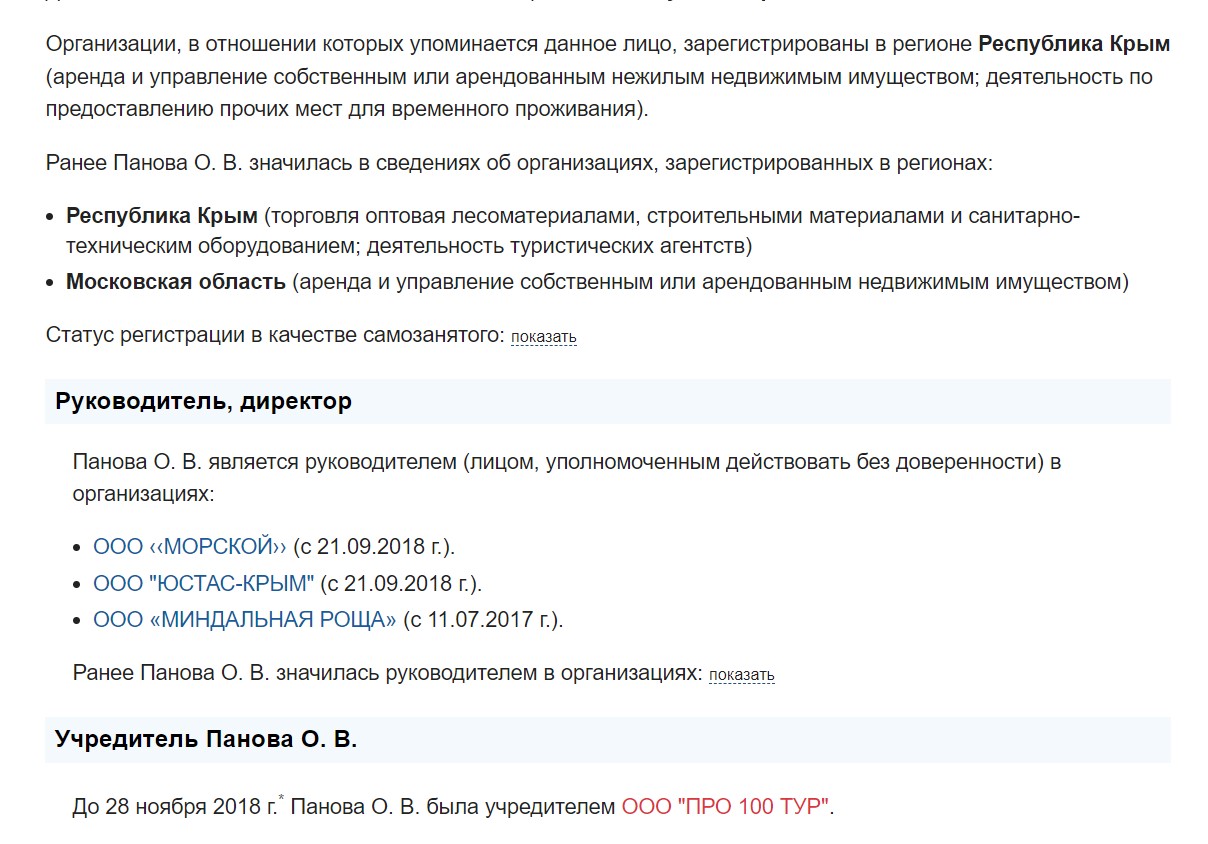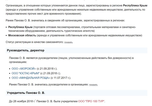 І - це не все. Тому що вивчення співвласників та керівників цих фірм дає ще цікавіший результат. У ТОВ «Морський» директором є Панова Оксана Володимирівна. Яка є одночасно керівником ТОВ «Міндальний гай», яке виступає співвласником ТОВ «Морський», та ТОВ «Юстас-Крим»: