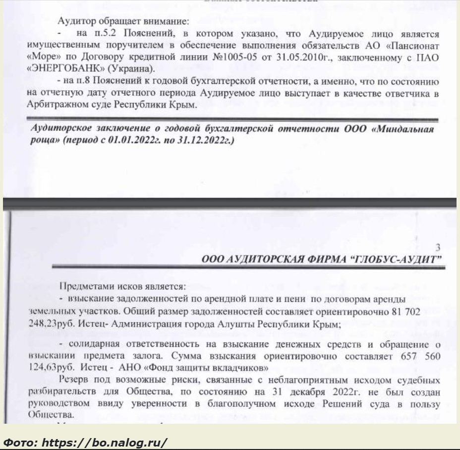 Від нього сліди ведуть до ТОВ «Юстас-Крим»: окрім фігури Панової, до мережі потрапили документи, що свідчать про те, що ТОВ «Міндальний гай» ще 2010 року доручився за боргами АТ «Пансіонат "Море"» в українському банку. А АТ "Пансіонат "Море"" раніше керувало компанією "Юстас-Крим".