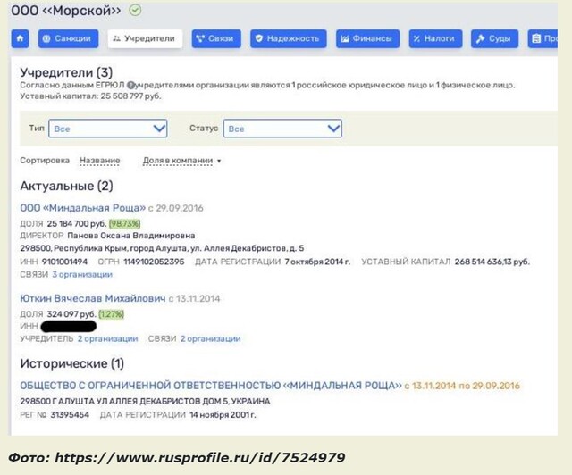 А в ТОВ «Морський» бенефіціаром виступає той самий ТОВ «Міндальний гай», що і у російських реєстрах: