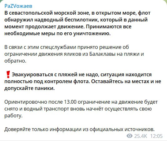 "У зв’язку з цим спецслужбами ухвалено рішення про обмеження руху із Балаклави на пляжі та назад", написав так званий "губернатор" Севастополя Развожаєв.