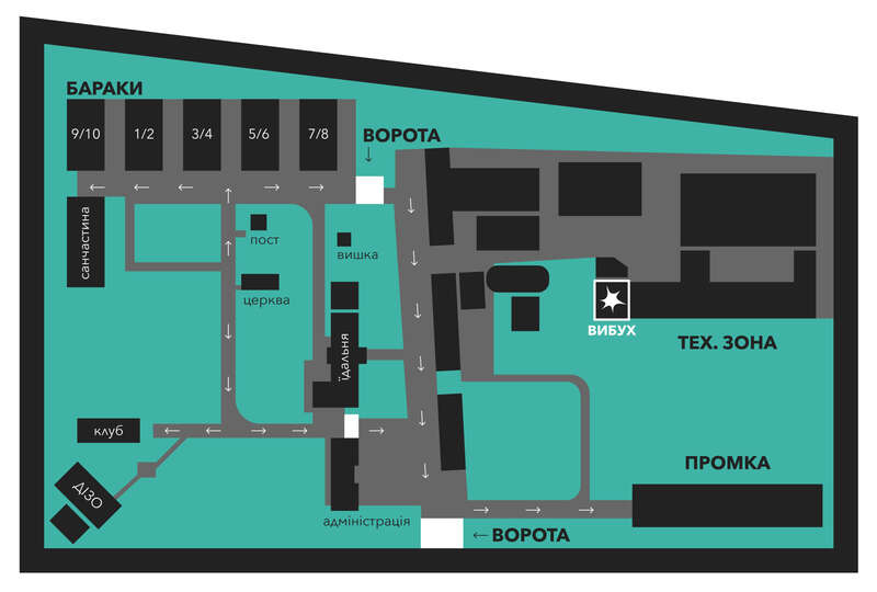 Барак, який підірвали, розміщувався на території промзони, яка ізольованої від решти території виправної колонії. Ніхто з азовців про неї спочатку не знав — її не використовували для утримання військовополонених. Промка розташовувалась у правій частині колонії.