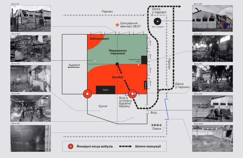 “Ми почули вибухи, але охорона наказала всім сидіти тихо, за непокору пригрозили розстріляти, — говорить чоловік. — Зранку по нас прийшли охоронці: “Ну що, ти готовий збирати руки-ноги? Ти ж був старшим на бараці 9/10? От іди і збирай”. Я подумав, що прилетіло в наш барак”.