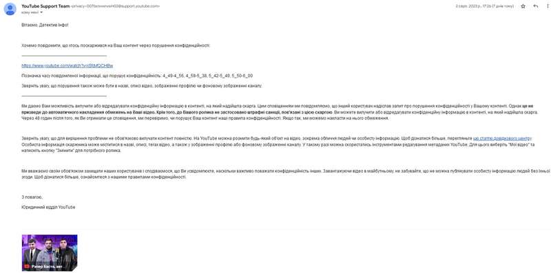 У відповідному посланні, що надійшло до редакції 2 серпня 2023 року, відеохостинг послався на отриману ним скаргу про порушення конфіденційності особи, яка присутня на чотирьох фрагментах розслідування під назвою "Рэпер Баста, авторитетный Полузверь и вор в законе Нодар Руставский: как "ростовские" рулят в Киеве".