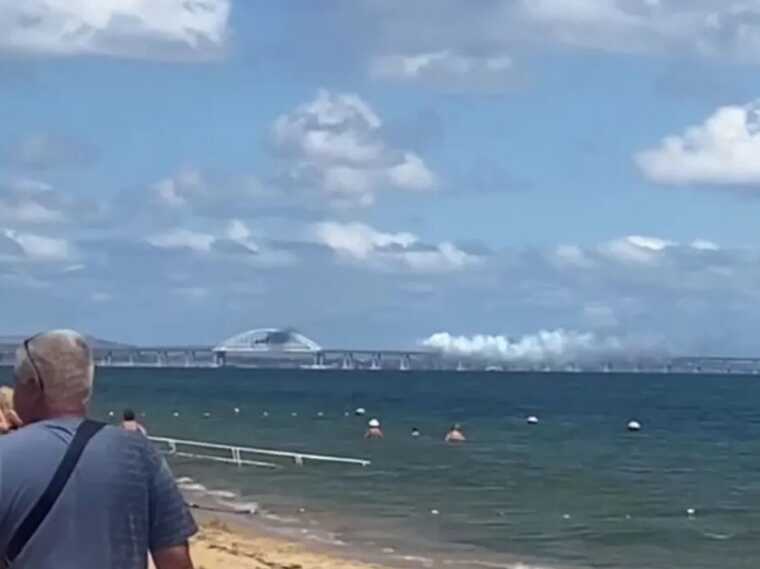 На оприлюднених кадрах натовп напівоголених відпочивальників на кримському пляжі спостерігає, як над Кримським мостом здіймається дим. Деякі фіксують поки що існуючий об’єкт на відео для історії.