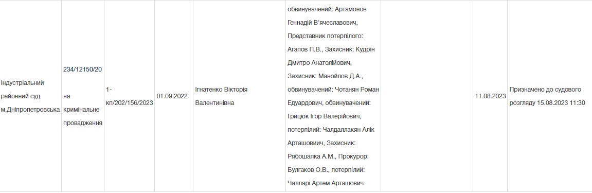 З них випливає: після того, як 20 червня 2023 року суддя Індустріального райсуду міста Дніпропетровська Вікторія Ігнатенко вкотре продовжила терміни безальтернативних арештів відносно Романа Чотаняна, Арсена Григор’яна, Ігоря Грицюка та Андрія Куліченка, апеляційна інстанція постановила пом’якшити запобіжні заходи обвинуваченим.