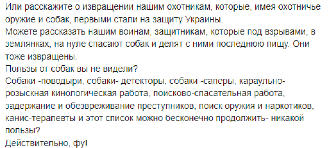 "Збоченці ... Бездітні ... Іграшка на 15 років ... Та де ж ви душу втратили? По-перше, дуже "дітні". Більшість собачників, виростивши дітей, починають піклуватися про собак і займатися з ними спортом. Є і такі, хто з немовлям у "кенгуру" відпрацьовує послух прямо в парку, а потім їде на міжнародні змагання і стає чемпіоном світу зі спортивного послуху. Можливо, ми божевільні. Але збоченці тут точно не ми. А ви і такі, як ви. Іграшка — це для вас. А для нас - життя", — пише Катерина Головачова, одна з користувачів мережі з Дніпра, яка звернула увагу на скандальні висловлювання.