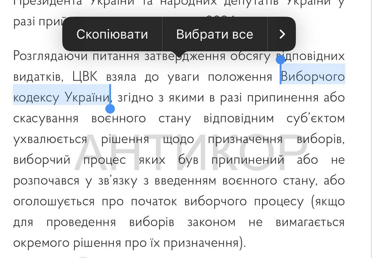 Повертаючися до самого тексту новини, там є один «цікавий момент». Єдиний законодавчий акт, на який посилається ЦВК (у питанні неможливості проведення виборів під час воєнного стану) — Виборчий кодекс Україну.