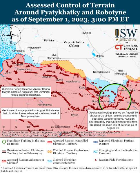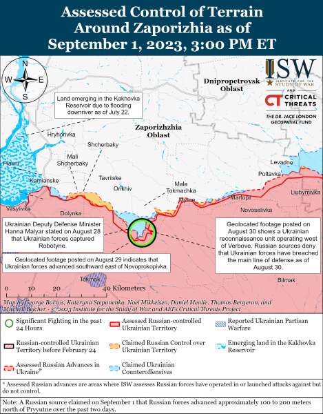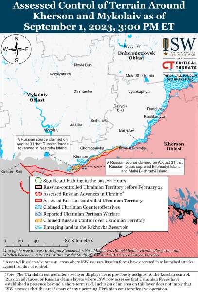 У Генштабі України повідомили, що російські війська вели безуспішні наступальні дії поблизу Новоселівського та Новоєгорівки. Російські джерела стверджували 1 вересня, що війська РФ нібито досягли невизначених успіхів поблизу Синьківки, Петропавлівки та Вільшан, ISW не спостерігало візуального підтвердження цих заяв. Російський "воєнкор" стверджував, що на Куп’янському напрямку точаться лише позиційні бої.
