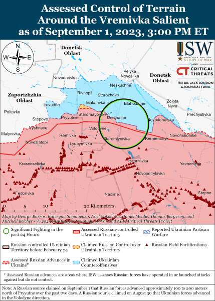 1 вересня українські війська продовжили наступальні операції у районі Бахмута і просунулися на південь від міста. Геолокаційні кадри, опубліковані 1 вересня, показують, що українські сили просувалися на північний захід від Кліщіївки.