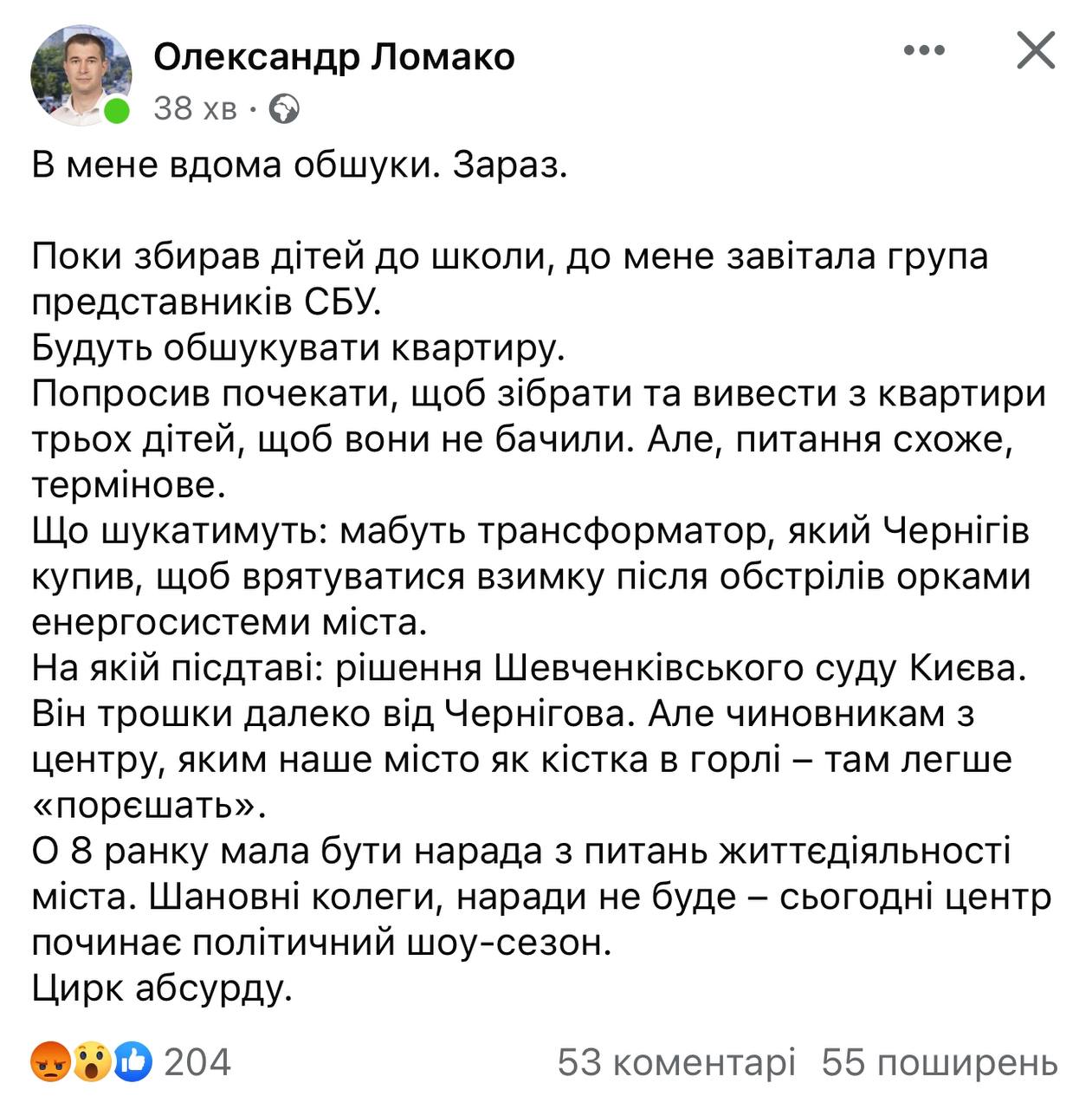 Виконуючий обовʼязки мера Чернігова Олександр Ломако повідомляє, що зранку у нього проводить обшуки Служба безпека України.
