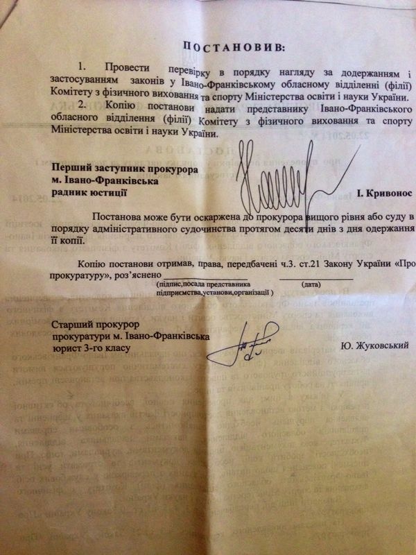 Прокуратура Ивано-Франковска начала проведение прокурорской проверки в отношении начальника областного отделения Комитета по физическому воспитанию и спорту Министерства образования и науки Украины Михаила Стефанкива.