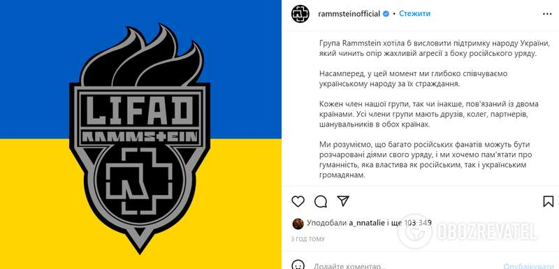 Зазначимо, що 4 березня 2022 року Rammstein у себе в Instagram підтримали Україну у війні з Росією.