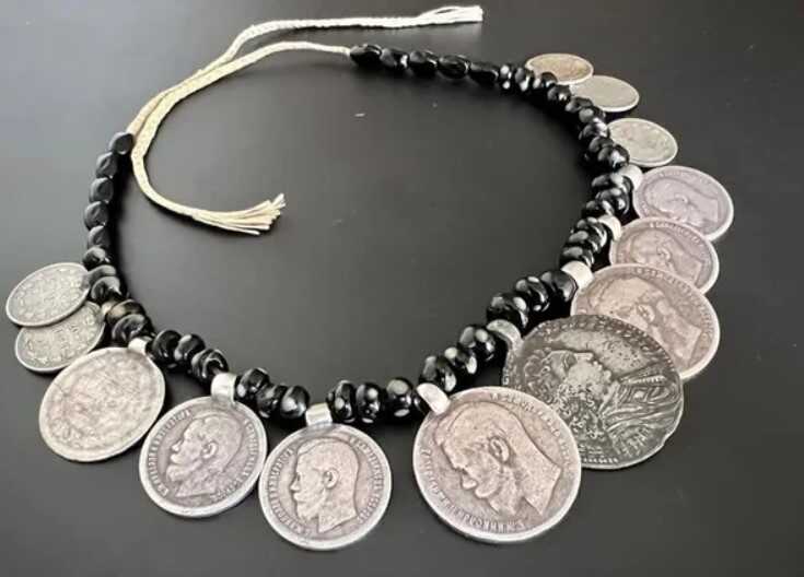 Окрім центральної, монети в намисті виготовлені зі срібла в період з 1896 по 1915 роки. Центральний же медальйон-дукач є імітацією монети "Рубль" з хрещатою монограмою замість герба, виготовлений, ймовірно, з олова у XVIII ст.