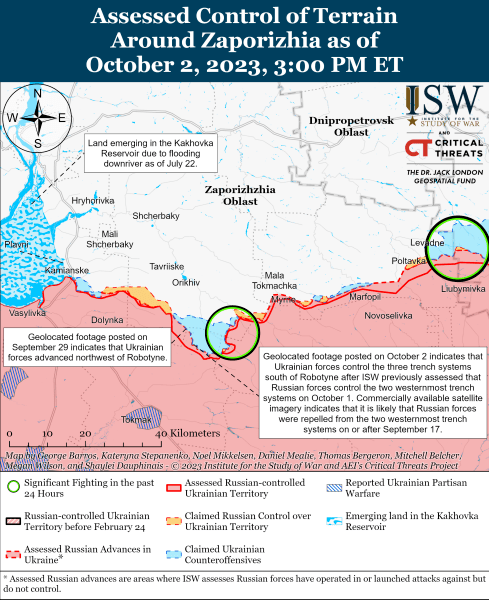 1 жовтня ISW оцінила, що українські війська втратили позиції на південний захід від Роботиного під час контратак Росії між 13 та 30 вересня. Однак в Інституті оновили оцінку на основі нових відеоматеріалів, опублікованих 2 жовтня, та супутникових знімків, які вказують на те, що українські сили все ще займають ці позиції та утримують їх приблизно з 12 по 17 вересня.