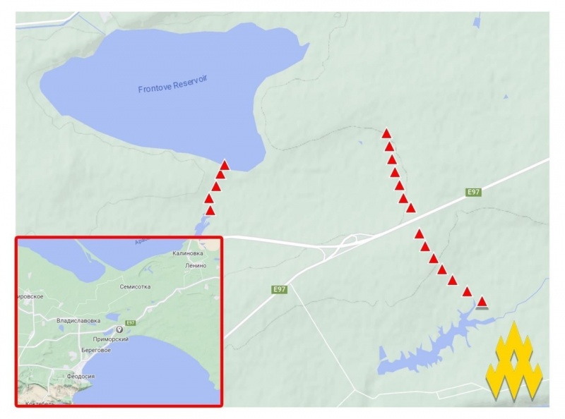 На опублікованих знімках видно, що росіяни почали зводити захисні споруди недалеко від Феодосії по трасі Е97 у бік Керчі. Там з одного боку дороги розмістили "зуби дракона", а з іншого оборона ділиться на дві лінії: