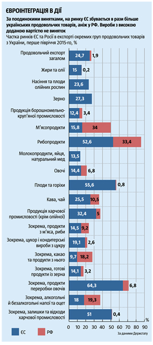 В течение последних лет было наглядно опровергнуты популярные мифы российской пропаганды о том, что «продукция украинской пищевой промышленности не конкурентоспособна на европейском рынке, где хватает своих товаров», как и утверждение, что в ЕС может экспортироваться только сельскохозяйственное сырье, а готовые изделия украинской пищевой промышленности имеют шансы только на рынке России и других государств СНГ. Реальность оказалась совсем иной: за первое полугодие 2015 года в ЕС было направлено почти треть (32,4%) всего экспорта готовых пищевых продуктов, а в РФ — всего 5%.
