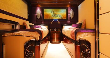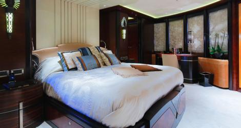 На яхте 5 кают, включая каюту владельца во всю ширину судна, в отделке которых используются самые разнообразные материалы и ткани, благодаря чему каждая из них обладает собственным стилем.