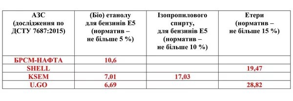 Відхилення від стандартів якості пального перевірка виявила у таких мережах, які працюють по всій Україні – БРСМ-Нафта, U.GO, АВІАС, BVS, та у трьох локальних мережах – 24/7, KCEM, DNIPRO OIL GROUP. Найбільше порушень стосуються таких показників як октанове число і вміст сірки. По кожному з них відхилення були у 4 компаній. І якщо у BVS та U.GO ці відхилення невеликі, то на заправках 24/7 та KCEM октанове число бензину А-95 не дотягувало навіть до 90 одиниць. Із вмістом сірки у пальному порушення ще масштабніші: у пробі, взятій на АЗС KCEM, вміст сірки перевищував норму у більш як 50 разів. В інших – до 3.