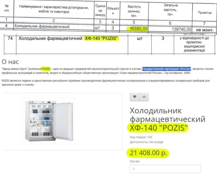 Холодильники ХФ-140, вартість яких оцінюється у 21,5 тис. рублів (7,7 тис. грн), передбачено придбати за 46,6 тис. грн. Це у шість разів дорожче, що означає переплату понад 100 тис. грн лише на одній позиції обладнання.