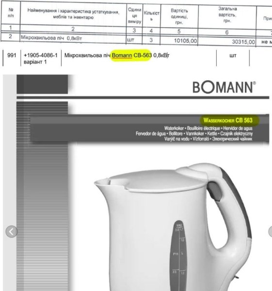 Побутову техніку також переоцінили. Під виглядом трьох мікрохвильових печей вимагається поставити електрочайники Bomann CB-563 вартістю 10 105 грн кожний.