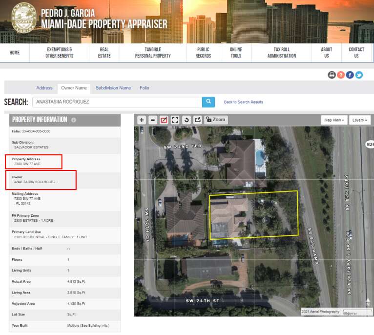 Та якщо доведено, що Анастасія Родрігес (Надал) володіє цією нерухомістю, то на сто відсотків можна стверджувати й про факт придбання нею 16 лютого 2023 року апартаментів у кондомініумі Wind у центрі Маямі за 380 тис. дол. Адже саме особняк на 7300 SW 77TH AVE Анастасія Родрігес вказала поштовою адресою при купівлі апартаментів у Wind.