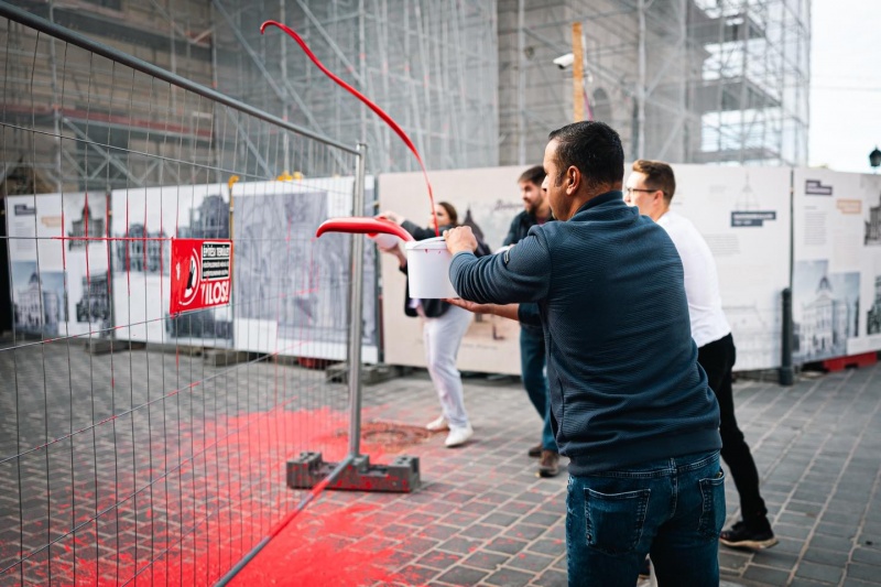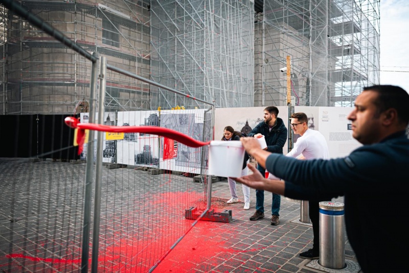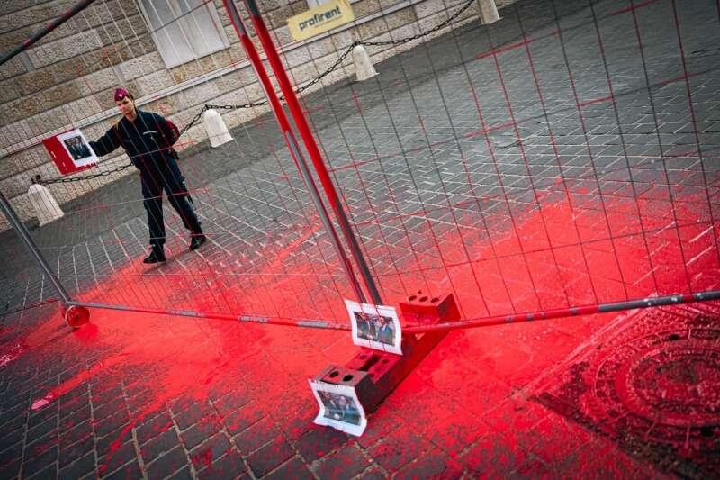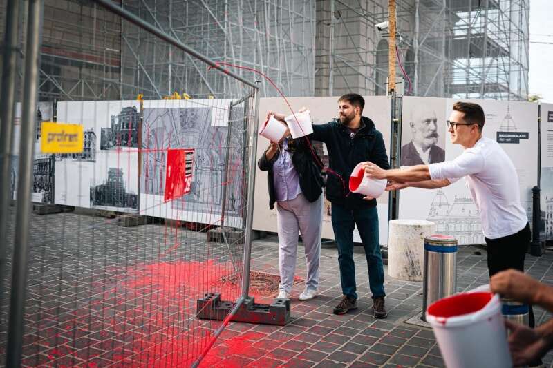 Депутати опозиційної парламентської фракції "Моментум" облили криваво-червоною фарбою паркан біля офісу прем’єр-міністра Угорщини Віктора Орбана у Будапешті.