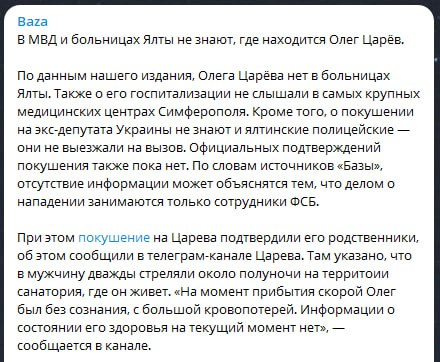У мережі з’явилася версія замаху на Олега Царьова в окупованій Ялті, згідно з якою українського зрадника наказала ліквідувати безпосередньо влада у Кремлі. Російські пропагадисти пишуть, що зараз Царьов у важкому стані перебуває в реанімації.