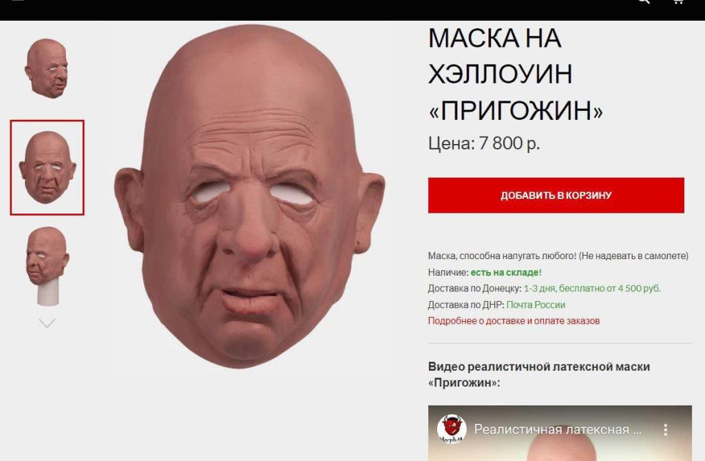 Так інтернет-магазини в окупованому Донецьку рекламують "реальну латексну маску" Пригожина для святкування Хеллоуїна.