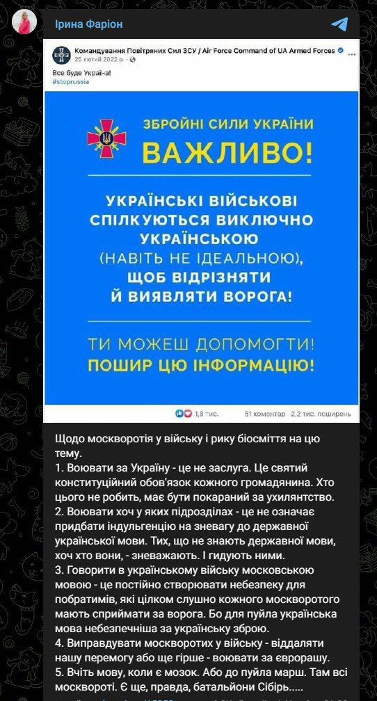 За словами Фаріон, україномовні військові "кожного москворотого мають сприймати як ворога". Також вона вважає, що російськомовних в армії треба "зневажати".