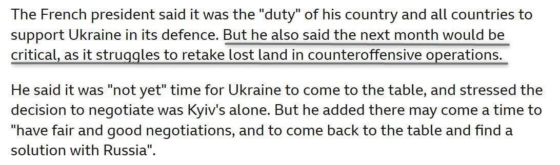 «Наступний місяць буде вирішальним, оскільки Україна щосили намагається повернути втрачені землі в ході контрнаступальних операцій», — передає видання слова Макрона. Певно, французький президент розраховує на якісь рішучі дії ЗСУ до кінця року.