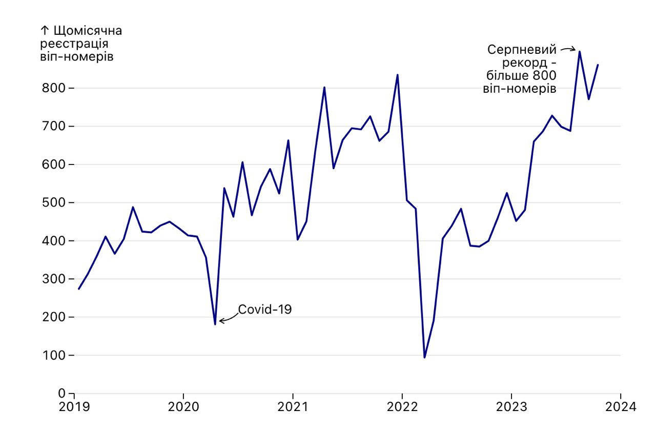 У серпні та жовтні 2023 року щомісяця реєструвалося понад 800 нових або імпортованих вживаних автомобілів з ексклюзивними номерними знаками.