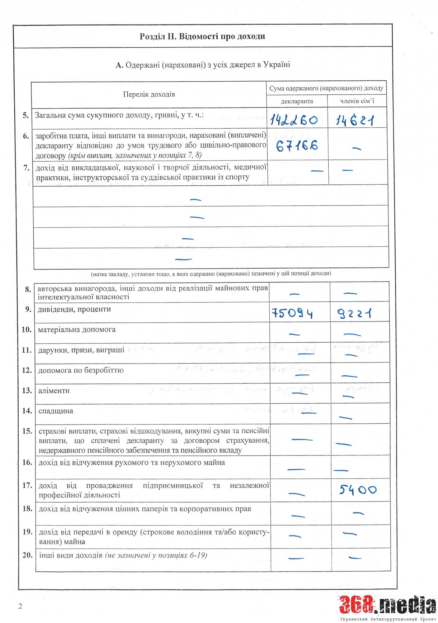 Так, за прошлый год советник заработал 67 тыс. гривен, а еще 75 тыс. гривен получил в качестве дивидендов от своих банковских вкладов. Доходы его супруг составили всего лишь 14,6 тыс. гривен, из которых более пяти тысяч гривен она получила от предприимательской деятельности, а остальное в виде дивидендов.