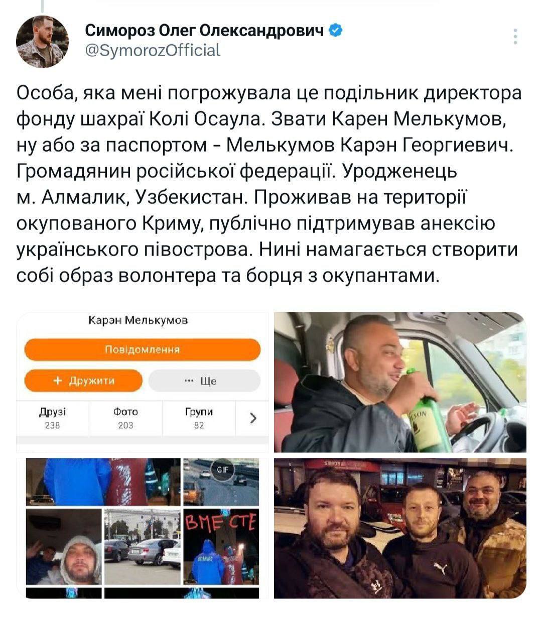 Під час розмови виявилося, що чоловіки у формі ніколи не були на фронті. Більш того, "вирішувати" питання приїхали тітушки. Один із них — попередньо, Карен Мельмуков, громадянин РФ, який підтримував анексію та раніше вів бізнес в окупованому Криму.