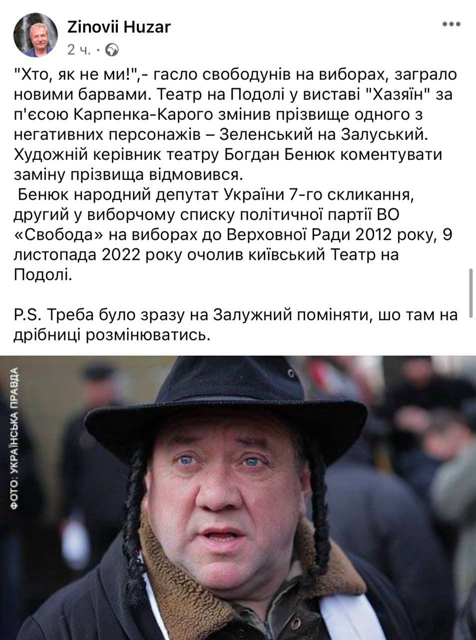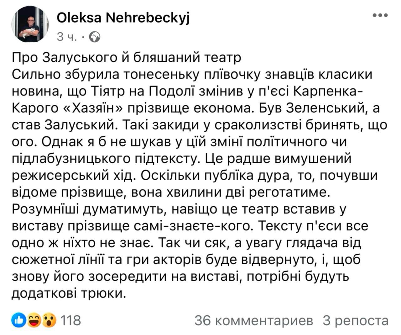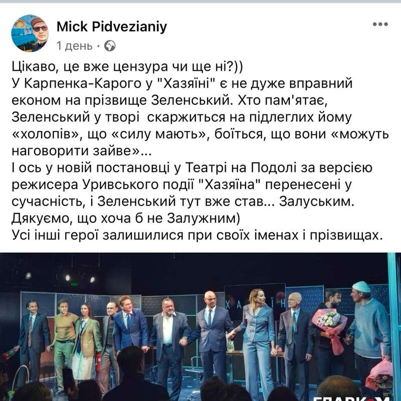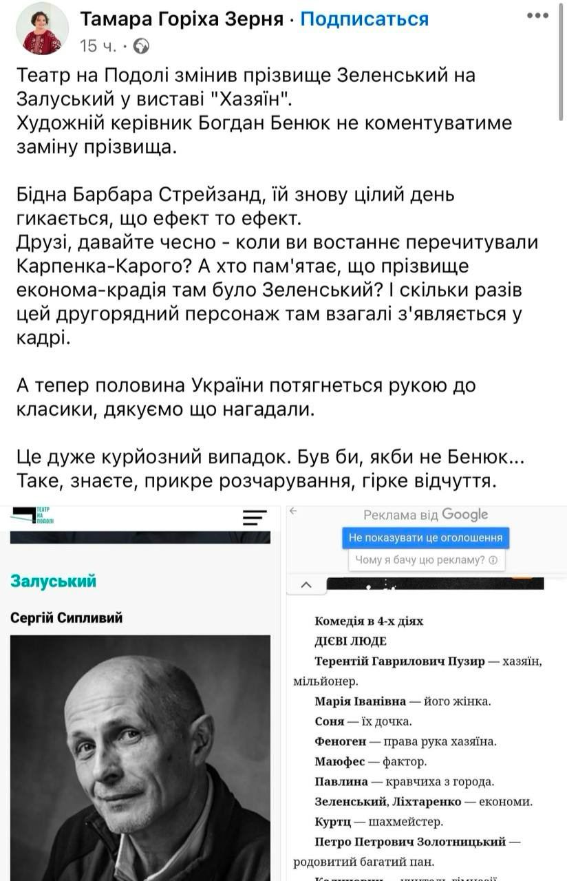 "У Карпенка-Карого в "Хазяїні" є не дуже вмілий економ на прізвище Зеленський. Хто пам’ятає, Зеленський у творі скаржиться на підлеглих йому "холопів", які "силу мають", боїться, що вони "можуть наговорити зайвого". І ось у новій постановці у Театрі на Подолі за версією режисера Уривської події "Хазяїна" перенесені в сучасність, і Зеленський тут уже став... Залуським", - зазначають користувачі соцмереж.