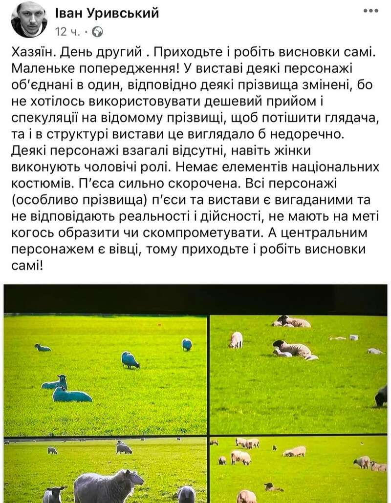 "Всі персонажі (особливо прізвища) п’єси та спектаклю вигадані і не відповідають реальності та дійсності, не мають на меті когось образити чи скомпрометувати. А центральним персонажем є вівці, тому приходьте та робіть висновки самі", - написав він.