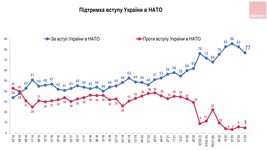 Підтримка вступу держави до НАТО має також тенденцію до зниження і становить 77% (в липні було 83%). Наразі показник підтримки вступу до НАТО на тому ж рівні який був на початку вторгнення у березні 2022 року. Однак не хотіли би бачити Україну в Північноатлантичному альянсі лише 5% опитаних, 15% - не голосували б, і 3% - не визначились.