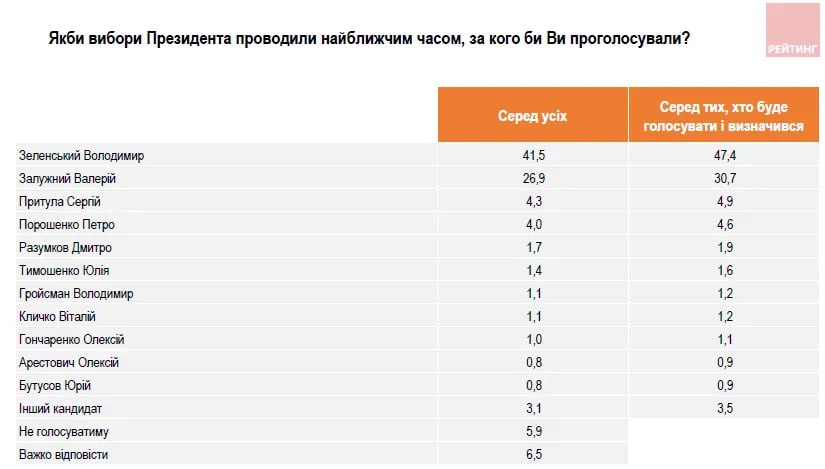 На гіпотетичних виборах, в яких брав участь і Зеленський, і Залужний, ніхто з них не здобув би перемоги у першому турі (у Зеленського – 47,4%, у Залужного – 30,7% серед тих, хто визначився із кандидатурою).