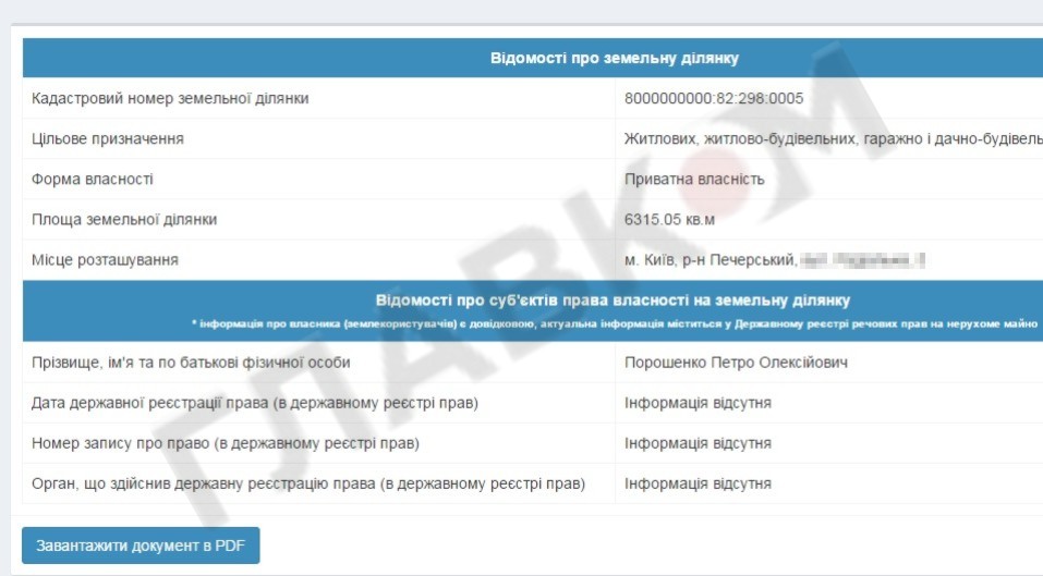 Размер побольше (63 сотки) имеет соприкасающийся с ним участок под номером 8000000000:82:298:0005. Согласно кадастровой карте, это – также собственность Петра Порошенко. Как ранее сообщало «Радио Свободы», здесь, по адресу Радиальная, 5, два года назад правоохранительные органы обнаружили разрушения части земляного вала Киевской крепости. Расследование длилось свыше полутора лет, но осенью 2014-го года производство закрыли.