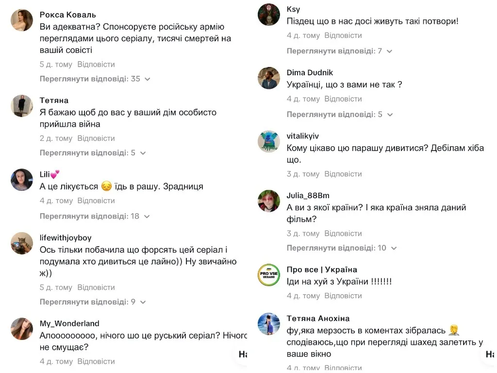"Ви адекватна? Спонсоруєте російську армію переглядами цього серіалу, тисячі смертей на вашій совісті", "А це лікується? Їдь в рашу. Зрадниця", "Ось тільки побачила, що форсять цей серіал, і подумала, хто дивиться це лайно... Ну звичайно ж", "Якщо люди навіть під час війни московську ригальню дивляться, то це клініка", "Краще сводку з фронту подивись, какаяразніца", "Алло, нічого шо це руський серіал? Нічого не смущає?" – залишають коментатори.