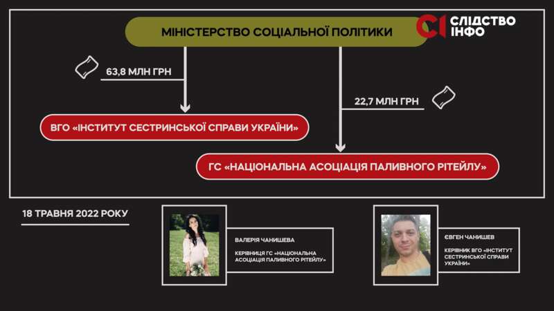 Ще дві організації сумарно отримали від Мінсоцу 86,5 мільйонів гривень. 18 травня 2022 року в обох змінилися керівники. Ними стали Валерія Чанишева та Євген Чанишев. Жінка очолила Асоціацію паливного рітейлу, а чоловік — Інститут сестринської справи.