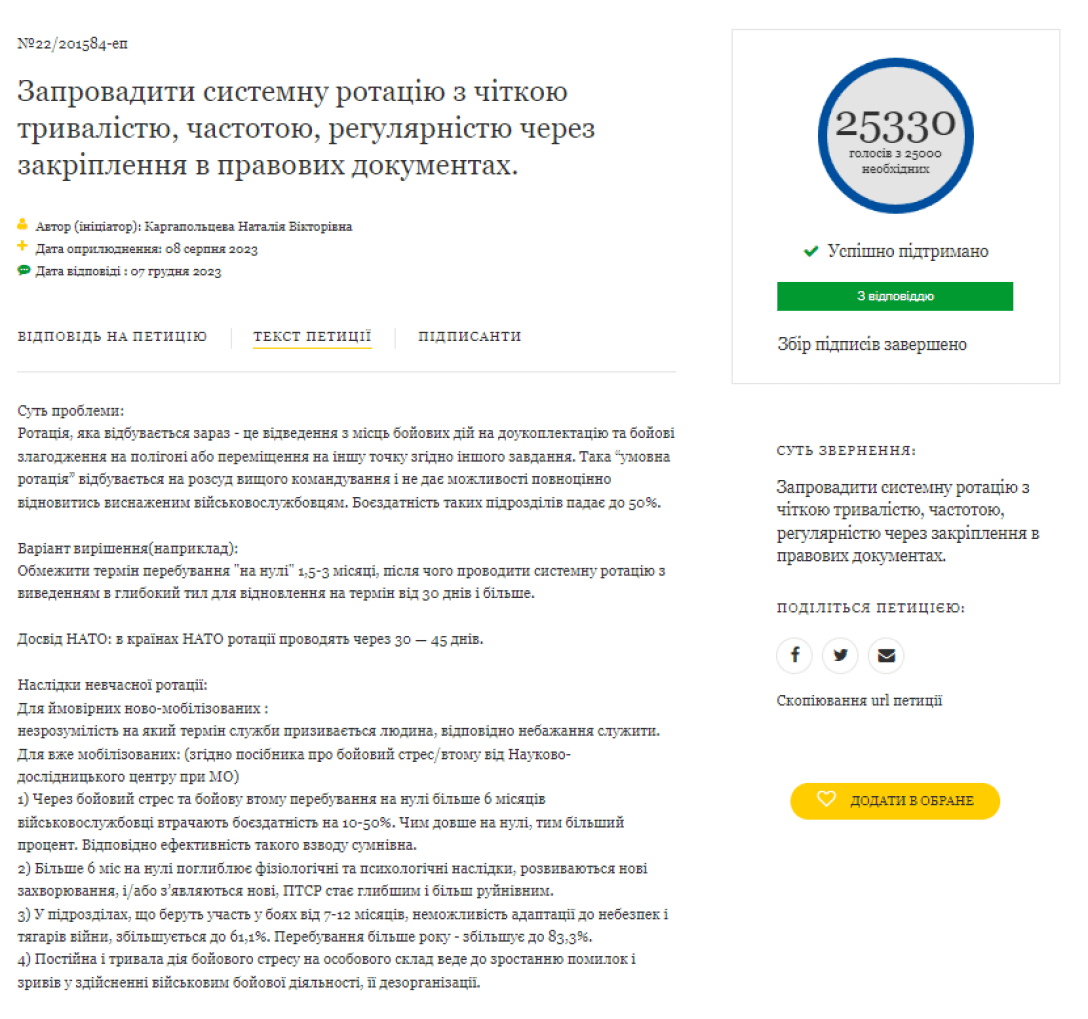 Також українці просять запровадити системну ротацію, яка матиме чітку тривалість, частоту та регулярність. Таку петицію 8 серпня зареєструвала Каргапольцева Наталія Вікторівна.