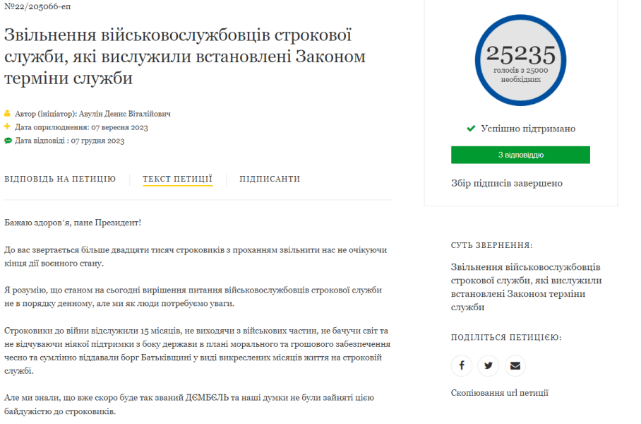 Третя петиція, на яку відповів Зеленський, стосується звільнення зі служби строковиків, які відслужили встановлені терміни. Зареєстрували петицію 7 вересня, її автором є Авулін Денис Віталійович.