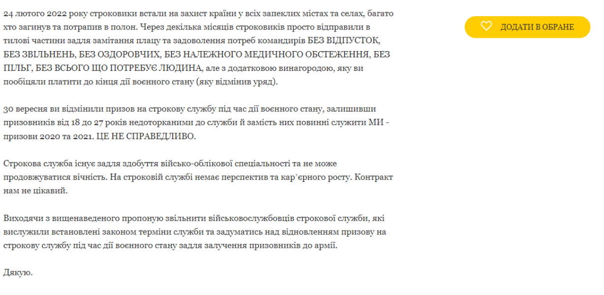 Автор звернення зазначає, що військовослужбовці строкової служби з перших днів повномасштабного вторгнення брали участь у бойових діях проти російської армії. Утім, через декілька місяців їх відправили в частини "задля замітання плацу та задоволення потреб командирів".
